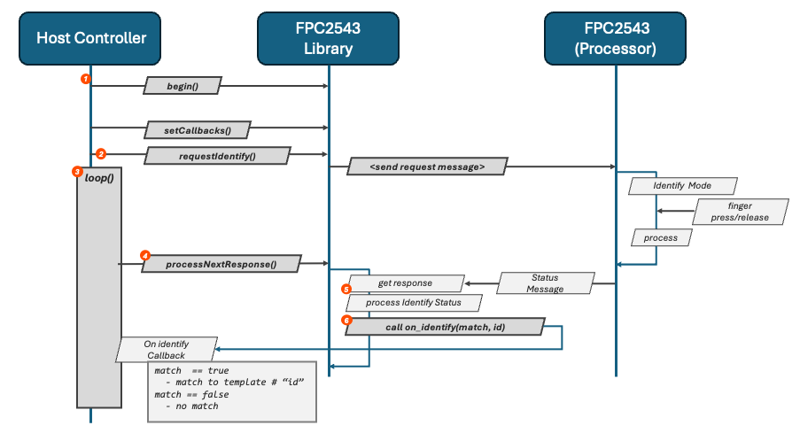 1) Standard setup, with a on_identify() callback function provided to the library. 2) Once the sensor is operational, the requestIdentify() method is called to start the identify process. 3) A standard loop() application pattern/method is started. 4) The method processNextResponse() is called on the library to get updates from the sensor. 5) The library identifies and parses an identify result message from the sensor. 6) The registered on_identify() callback method is called with the results from the identify operation.