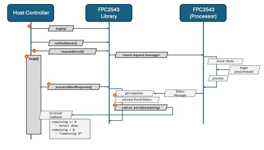 1) Standard setup, with a on_enroll() callback function provided to the library. 2) Once the sensor is operational, the requestEnroll() method is called to start the enrollment process 3) A standard loop()* application pattern/method is started. 4) The method processNextResponse() is called on the library to get updates from the sensor. 5) The library identifies and parse an enrollment status message from the sensor 6) The registered on_enroll() callback method is called, with the number of samples remaining.