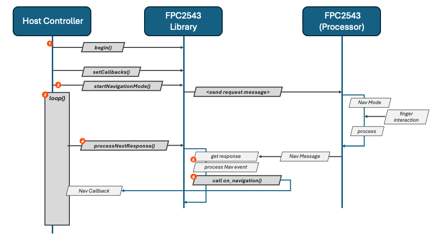 1) Standard setup, with a on_navigation() callback function provided 2) Once the sensor is running, start navigation mode. The sensor will interpret finger movements as navigation events and send messages when events are detected. 3) Loop mode is entered 4) Messages from the sensor are processed 5) When a navigation event message is identified, the message is parsed and the corresponding navigation event sent to the supplied on_navigation() callback function.