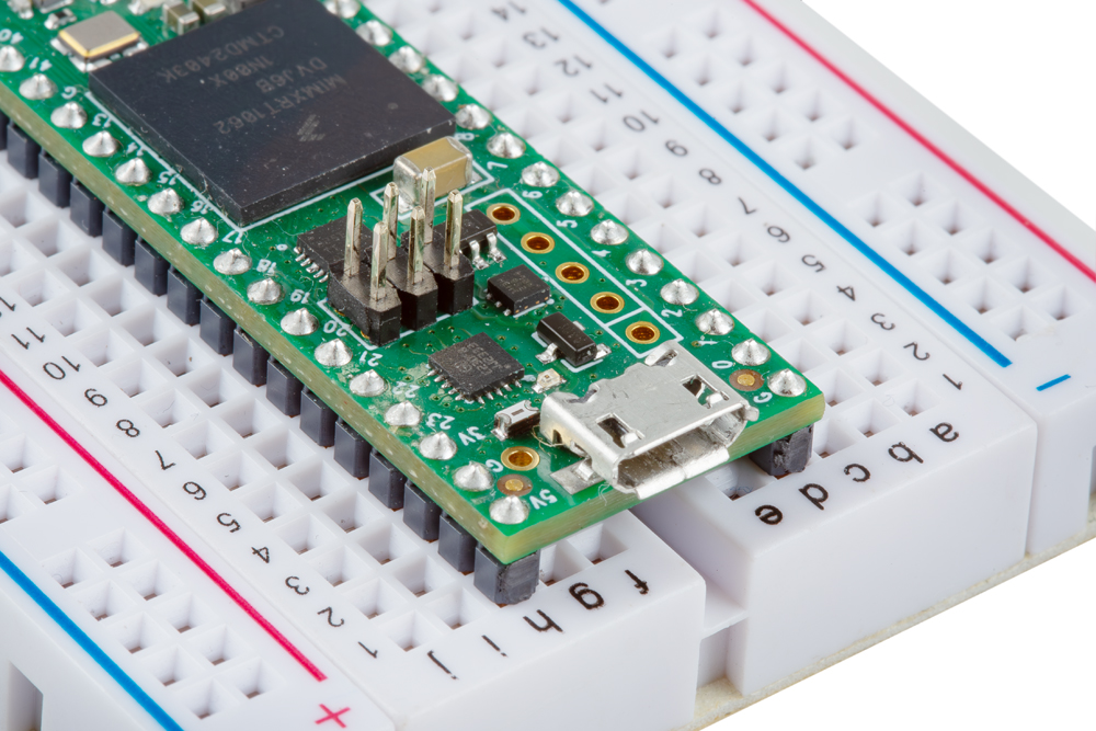 We recommend soldering this header with the longer ends of the pins on the top of the board to make it easy to plug into with the Teensy seated on a breadboard like this: