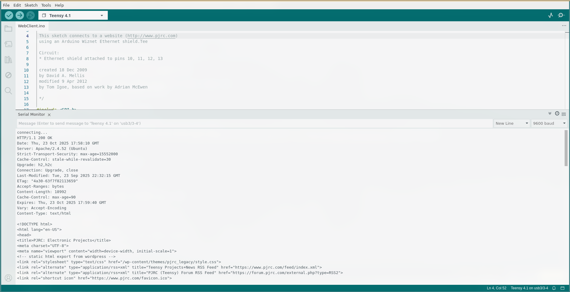 Now that we have everything assembled, connected and installed, let's run a quick test sketch in Arduino to make sure we can connect to the Internet. For this we'll use the WebClient example included in the Ethernet Arduino Library to connect to a website (in this case, http://www.pjrc.com) and print out . Open the example by navigating to File > Examples > Ethernet > WebClient. Select your Board and Port and click the "Upload" button.