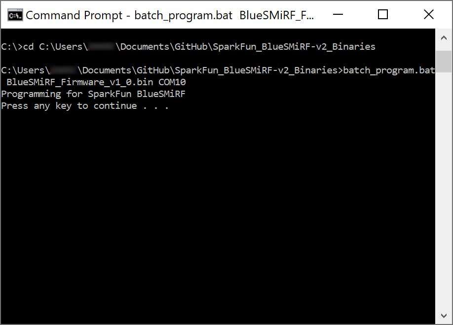 You'll then need to run the 'batch_program.bat' along with the binary file name and COM port. Enter the following command below, where COM4 should be replaced by the COM port you identified earlier and BlueSMiRF_Firmware_v1_0.bin is the firmware that you are updating to. Make sure to send an additional key to run the batch file.