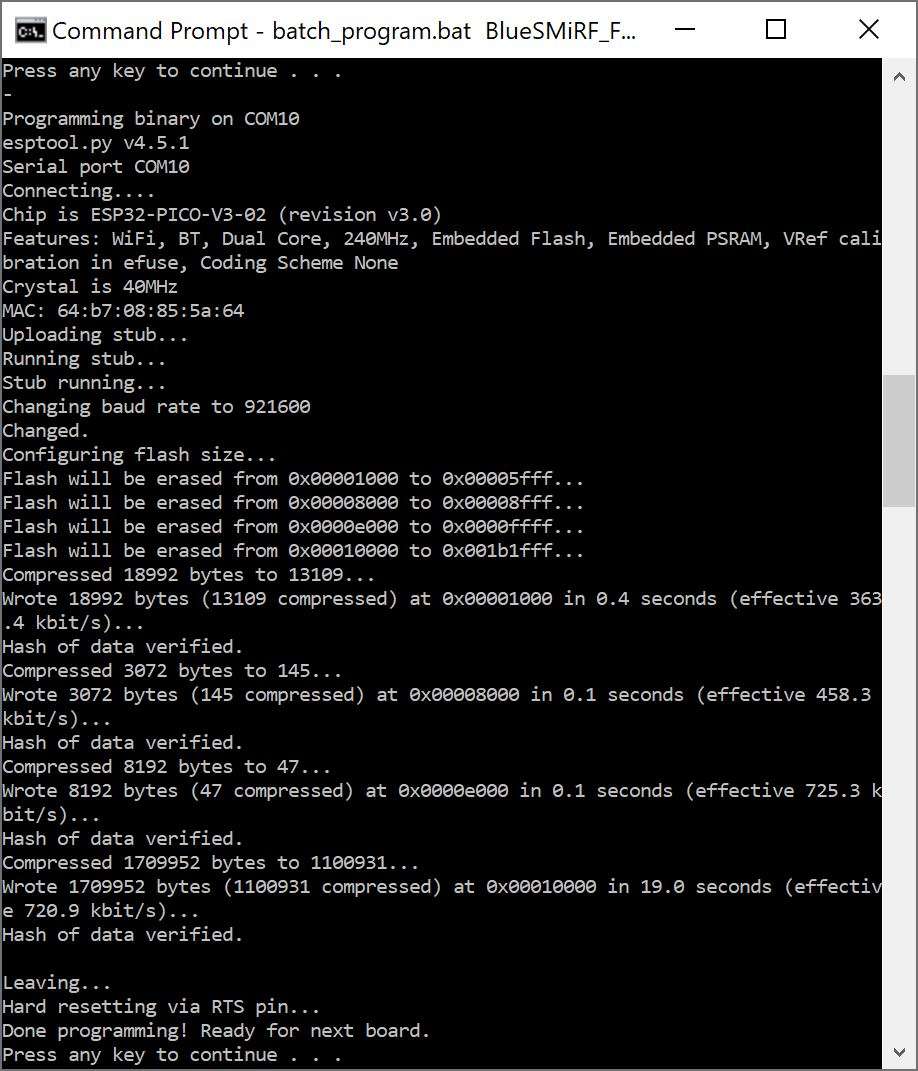 esptool.exe --chip esp32 --port COM4 --baud 921600 --before default_reset --after hard_reset write_flash -z --flash_mode dio --flash_freq 80m --flash_size 8MB 0x1000 bins/bootloader.bin 0x8000 bins/partitions.bin 0xe000 bins/boot_app0.bin 0x10000 BlueSMiRF_Firmware_v1_0.bin