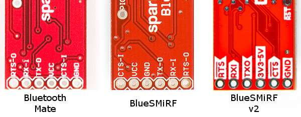 With this revision, we also settled on a 6-pin layout to breakout the flow control pins of the serial interface. Additionally, in response to the growing popularity of miniaturized development boards, like the Arduino Pro and Pro Mini, we introduced a new variant with a compatible pin layout. The BlueSMiRF Mate variants had a pin layout ( GND/CTS/VCC/TXO/RXI/RTS) that matched the USB-to-Serial adapters that were used to program and interface with the development boards. This allowed users to easily extend the capabilities of their board with the BlueSMiRF Mate.