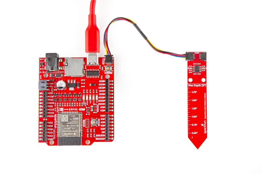 In this Quick Start guide we'll assemble the SparkFun Qwiic Soil Moisture Sensor (Capacitive) in a Qwiic circuit with the SparkFun RedBoard - IoT (ESP32) and then demonstrate how to calibrate the sensor and get soil moisture data from it using the SparkFun CY8CMBR3x Arduino Library. This guide assumes users have an understanding of the Qwiic ecosystems and how to use development boards with the Arduino IDE.