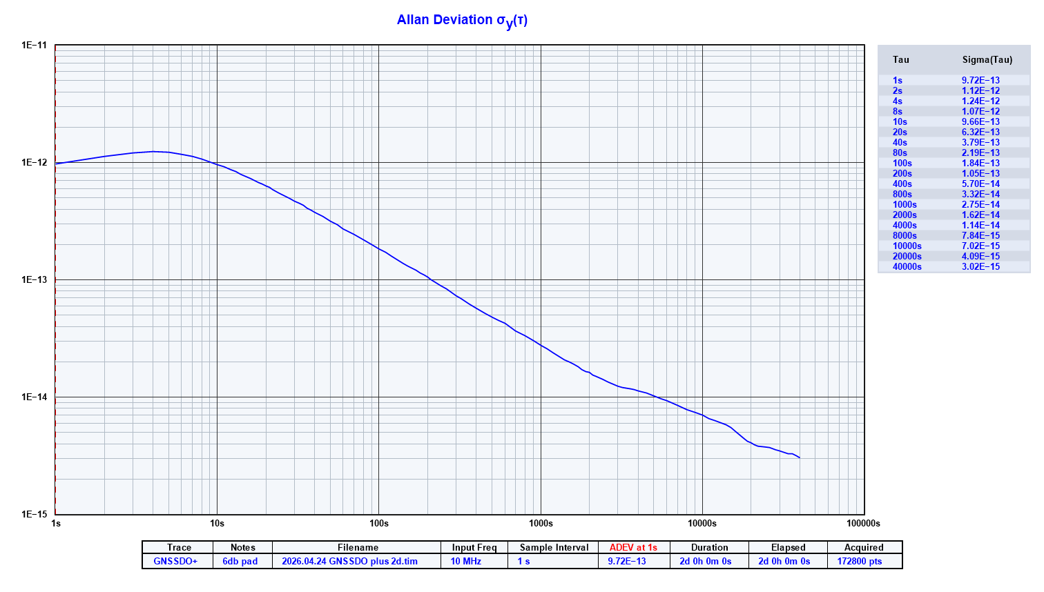- Allan Deviation approaches 1E-14 at 10000 seconds with AtomiChron enabled