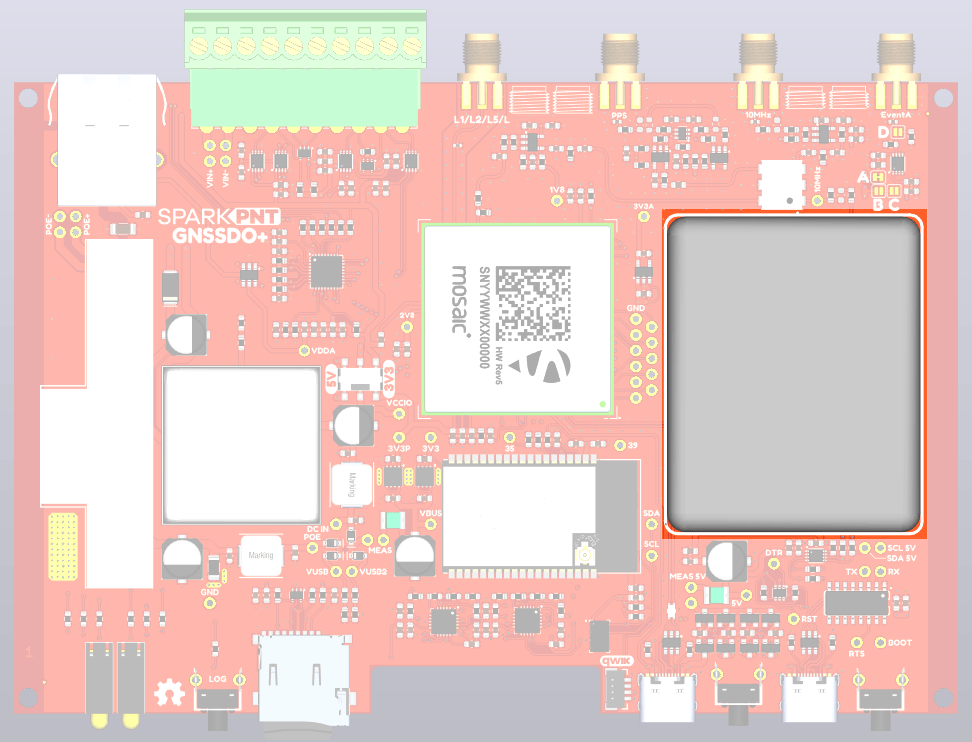 For excellent frequency accuracy and stability, the SparkPNT GNSSDO utilizes a SiTime SiT5358 Digitally-Controlled Temperature-Controlled Crystal Oscillator (DCTCXO). The SiT5358 is a precision MEMS Super-TCXO optimized for ±50 ppb stability from -40°C to 105°C. Engineered for best dynamic performance, it is ideal for high reliability telecom, wireless and networking, industrial, precision GNSS and audio/video applications.