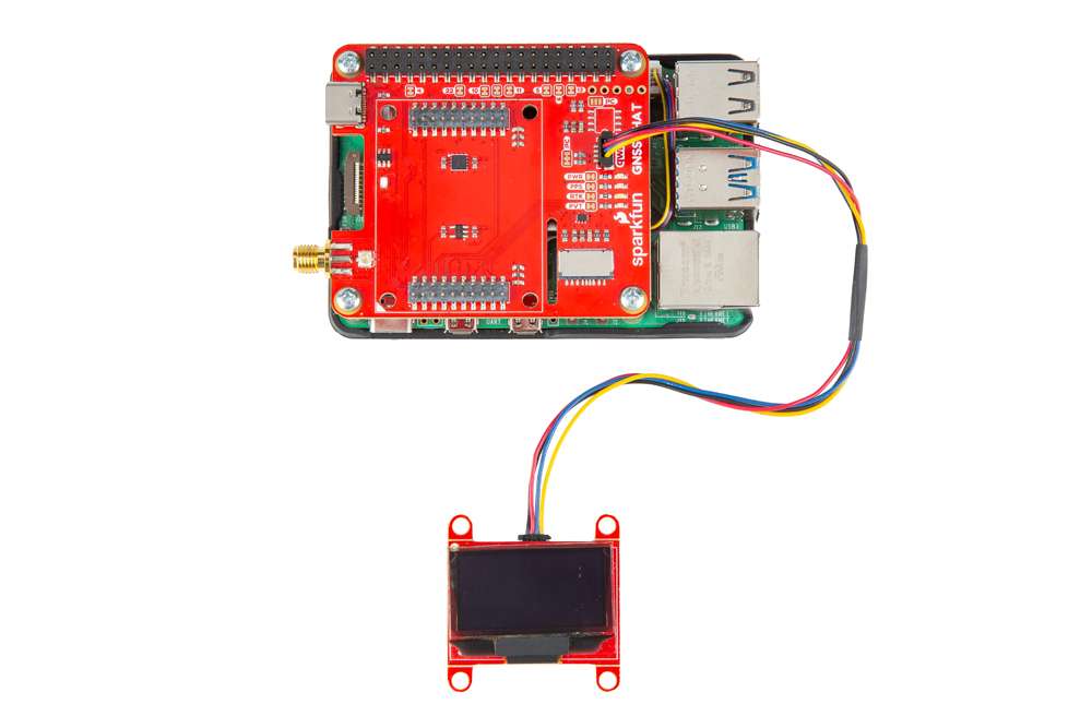 A Qwiic OLED display connected to the GNSS Flex pHAT.