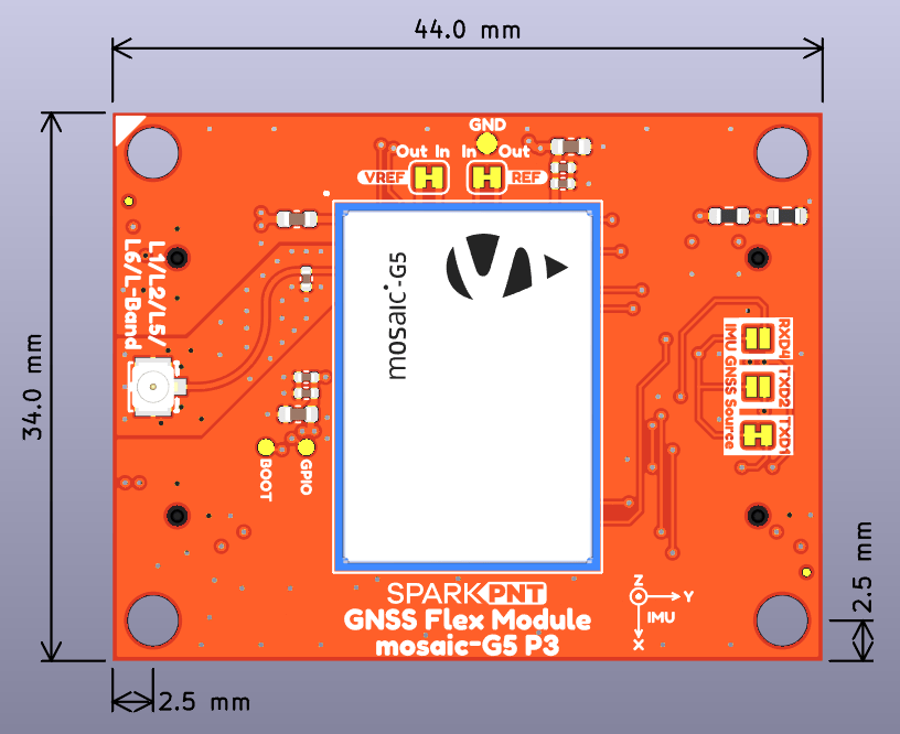 - The GNSS only variant of the SparkPNT GNSS Flex module that only includes the mosaic-G5 P3 GNSS receiver; without populating the IM19 IMU.
