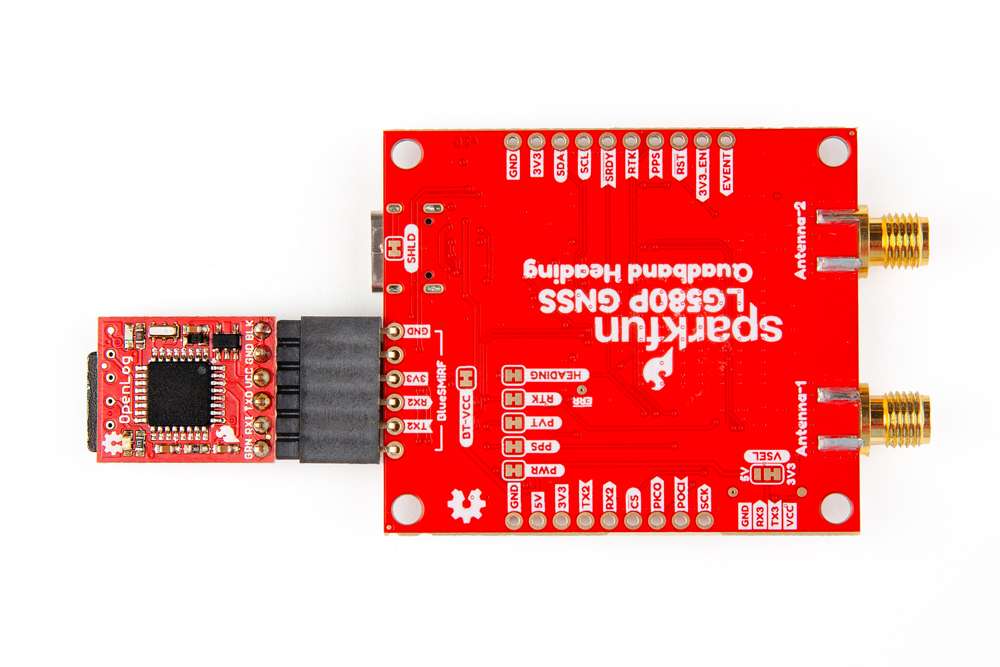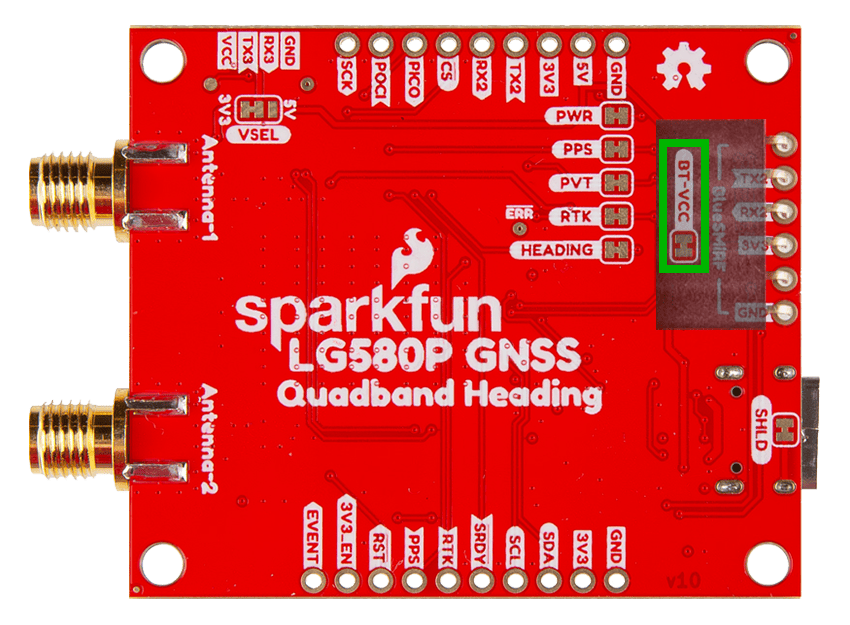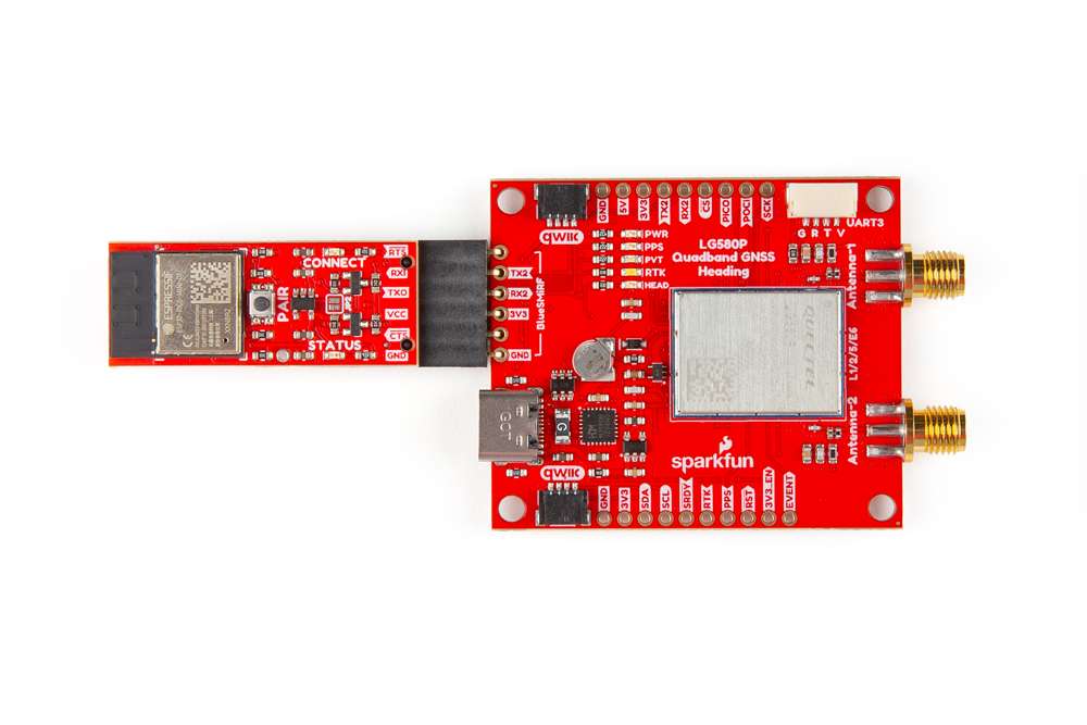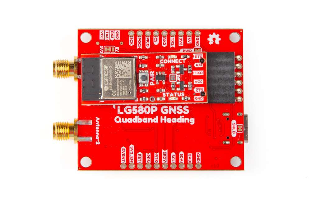 The BlueSMiRF header pins on the Quad-band GNSS RTK board, breaks out the UART2 port of the LG580P GNSS module. This pin layout is perfect for connecting a serial-to-UART adapter or a transceiver for serial data, such as the BlueSMiRF Bluetooth™ serial-link.