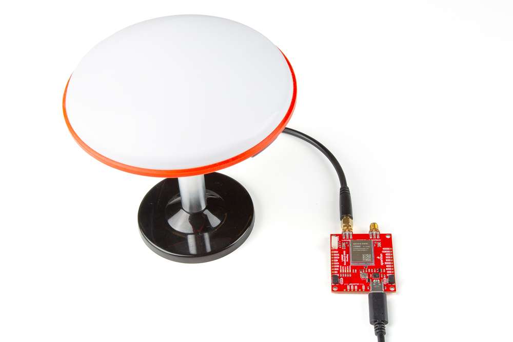 A GNSS antenna attached to the SMA connector on the Quad-band GNSS RTK breakout board.