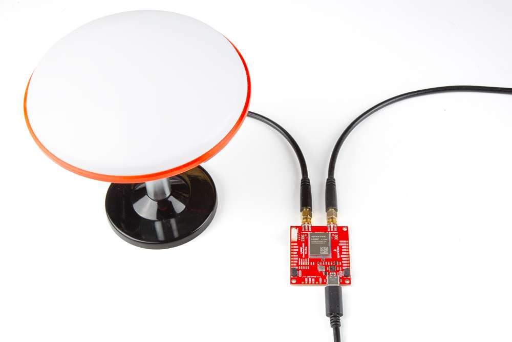 Two GNSS antennas attached to the SMA connectors on the Quad-band GNSS RTK breakout board.