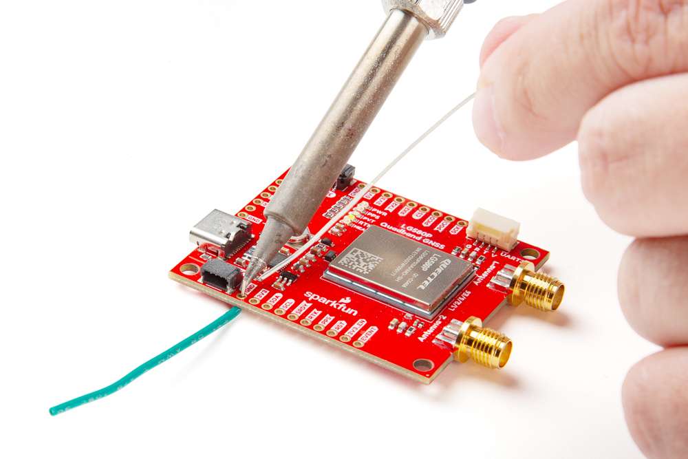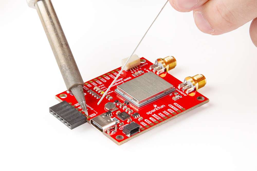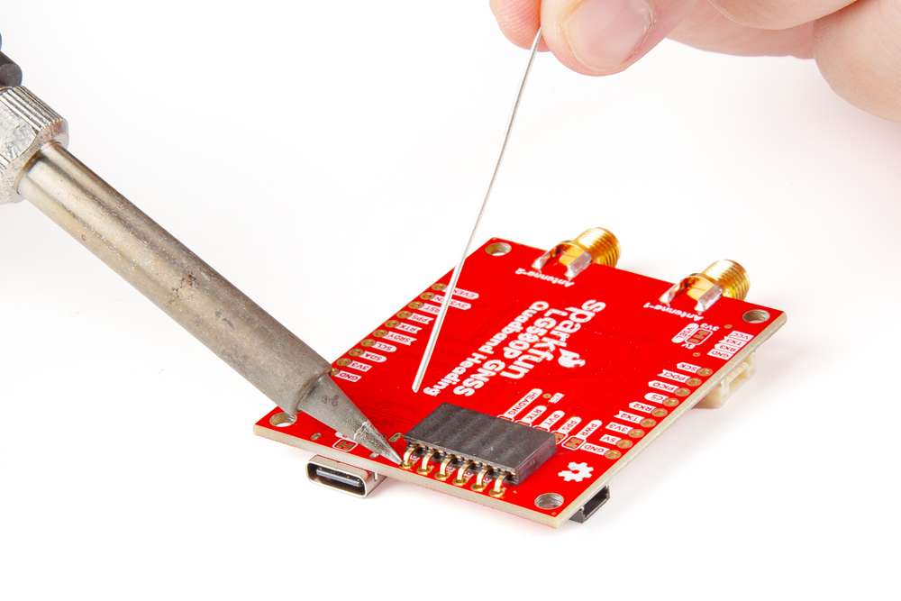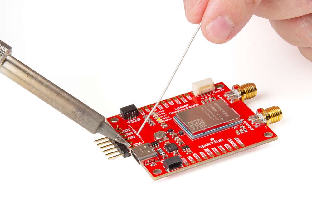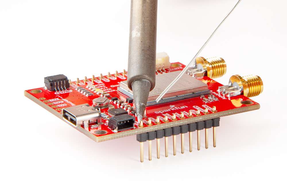 Soldering headers to the Quad-band GNSS RTK breakout board.