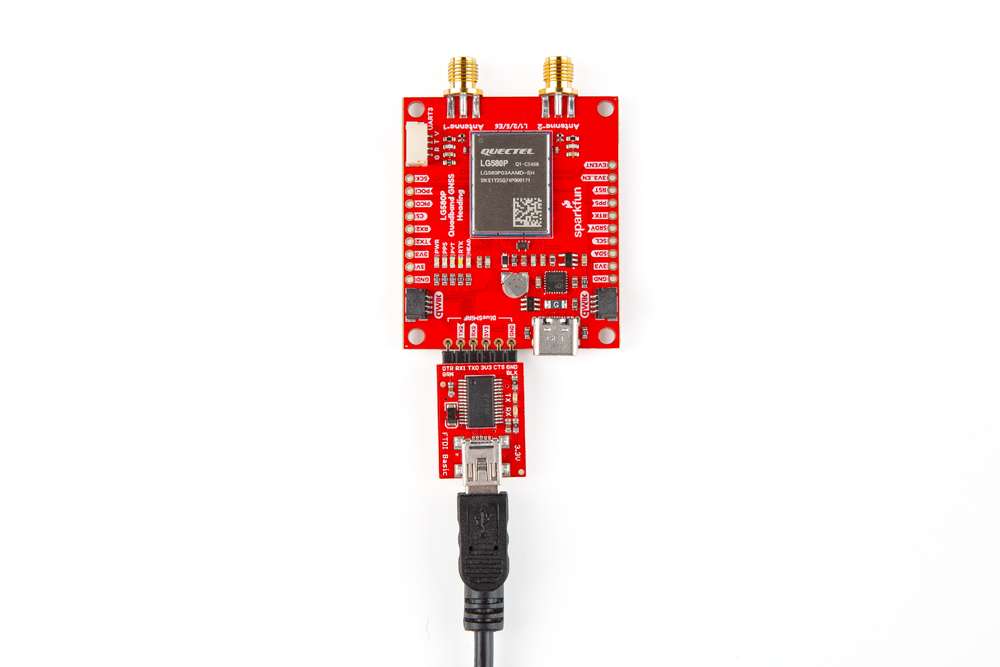 Connecting a UART adapter (Serial Basic) to a male header that was soldered to the Quad-band GNSS RTK breakout board. This will allow users to configure the LG580P, when the USB connection is unavailable.