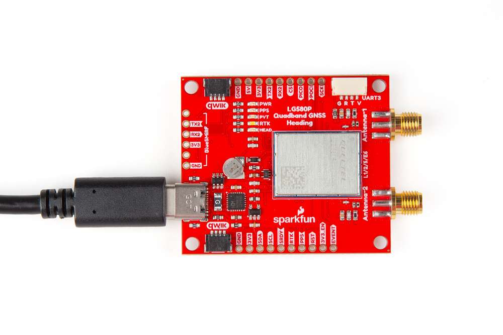 The Quad-band GNSS RTK breakout board with USB-C cable being attached.