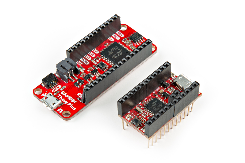We will be using the RedBoard Turbo with female headers already installed on the board. For users that are using a different board, now would be a good time to solder headers or wires to the board. Below is an example with female headers soldered on the SAMD51 Thing Plus. Additionally, there are stackable headers soldered on the SAMD21 Mini Breakout so that the board can be inserted into a breadboard.