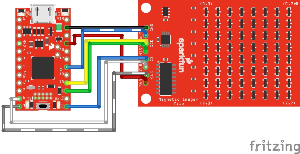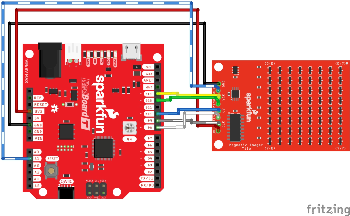 Below is the Fritzing diagram of the RedBoard Turbo - SAMD21 connected to the Magnetic Imaging Tile.