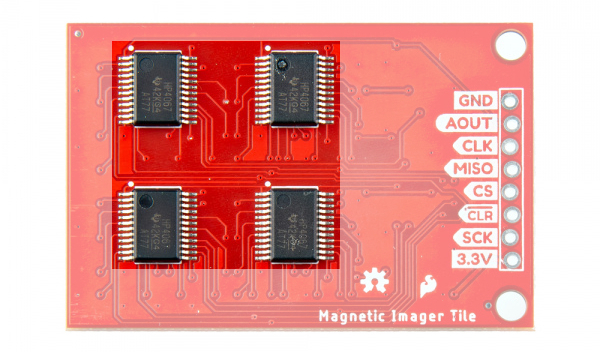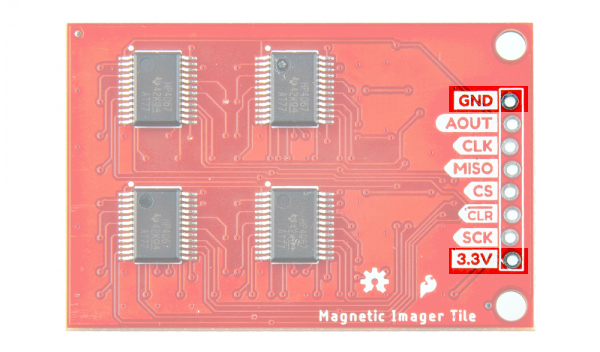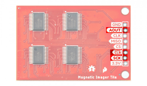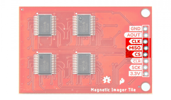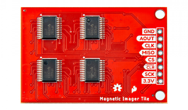 With a 16-bit ADC and a 3.3V range, this is approximately 50mV per bit. The Magnetic Imaging Tile is able to detect roughly +/- 0.5mT per bit. For our demo in the GIF we used a RedBoard Turbo with the SAMD21 to clock out the ADC data to the serial port at 115200. The serial is then parsed by a Processing sketch. This setup can achieve over 76 frames per second. With buffering the setup is capable of 200 fps. The ChipKit MAX32 is also supported and can achieve around 2,000fps. A faster processor should be able to achieve 1500fps (the 100kSPS limit of the ADC). The raw analog signal is also exposed. This allows processors that have built-in faster ADC to convert the signal directly. The theoretical limit of the DRV5053 is around 20,000 fps but would require a very fast ADC.