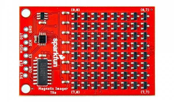 The major advancement of the current design (SparkX v3.0, SparkFun v1.0) is a dramatic increase in the speed with which the tile data can be read out. ~2000 frames per second (fps) can be achieved which allows visualizing even quickly varying fields (e.g. those in a 60Hz transformer, or a moving motor). Version 3.0 reduces the size of the tile to an 8x8 grid of hall effect sensors (64 total), arrayed in a 4mm grid. The boards is tile-able with up to 4 of the boards tile-able with minimal borders to create a 16x16 array.
