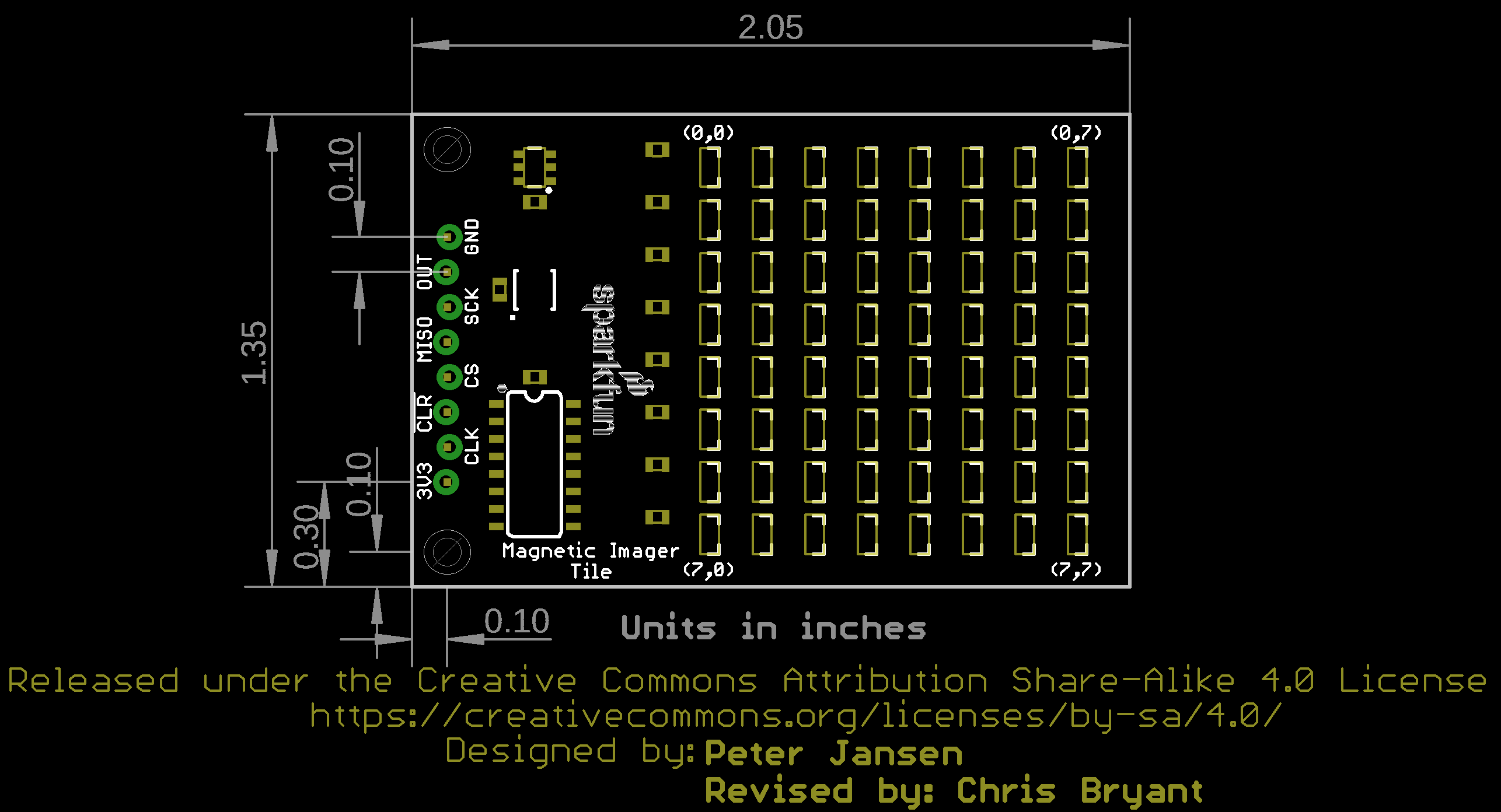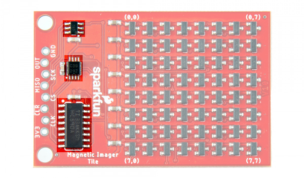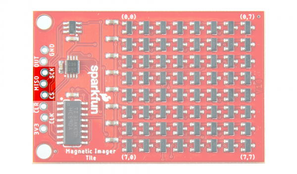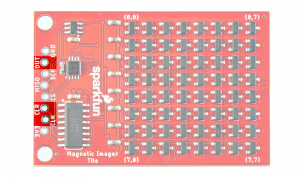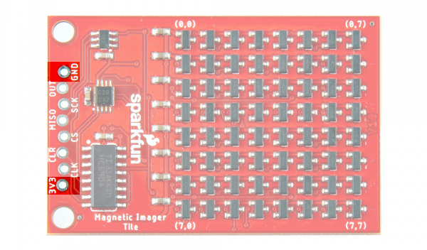 The Magnetic Imaging Tile consists of 64x analog hall effect sensors arranged in an 8x8 grid. The specific hall effect sensor used is DRV5053VA with a sensitivity of -90mV/mT. The coordinates of each sensor is indicated by the silkscreen by the corners of the 8x8 array of hall effect sensors.