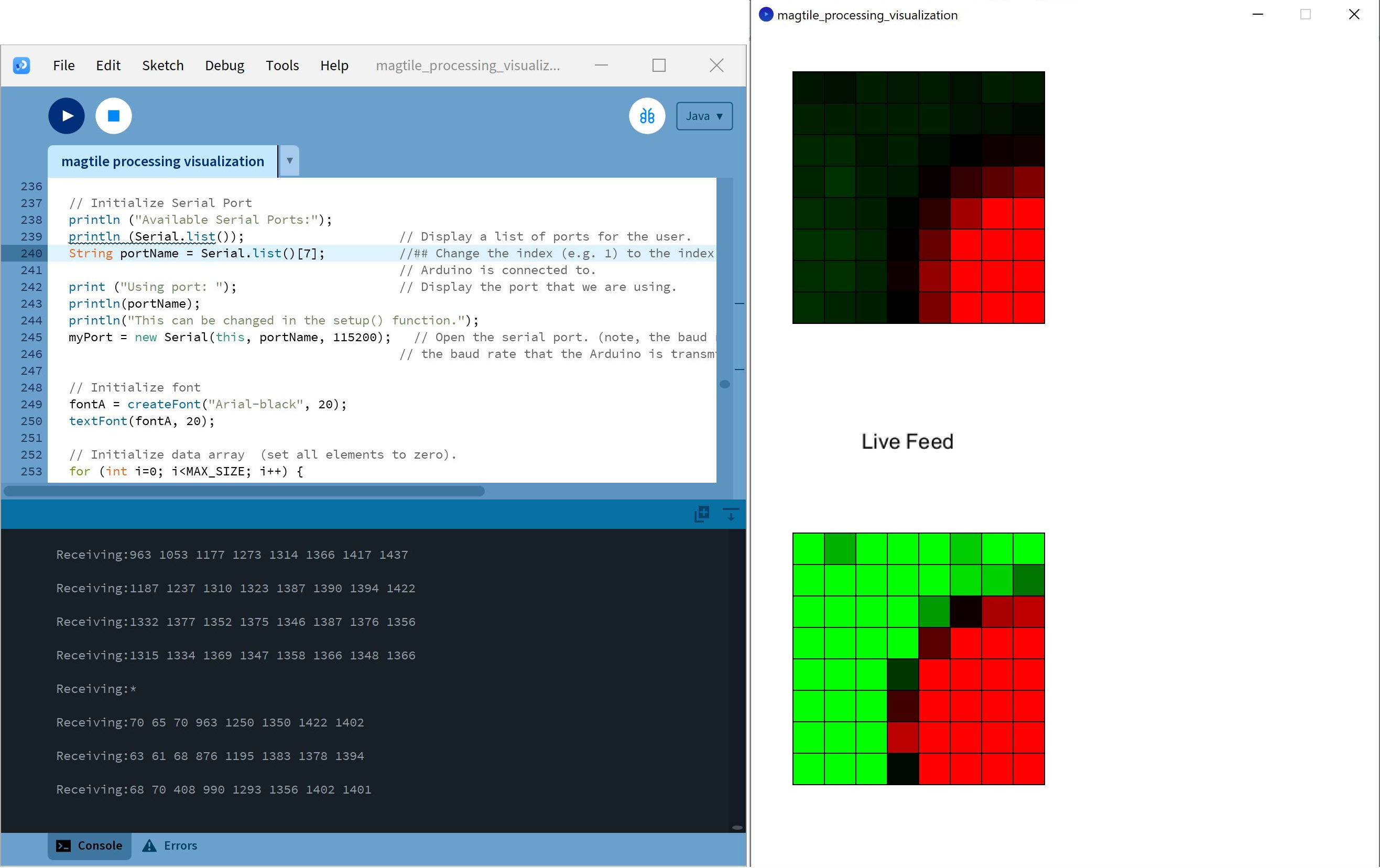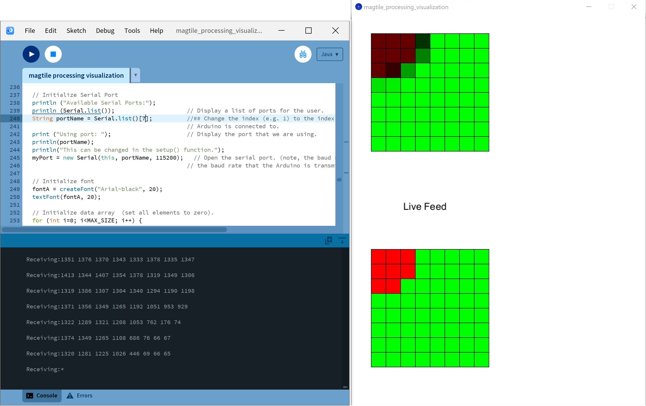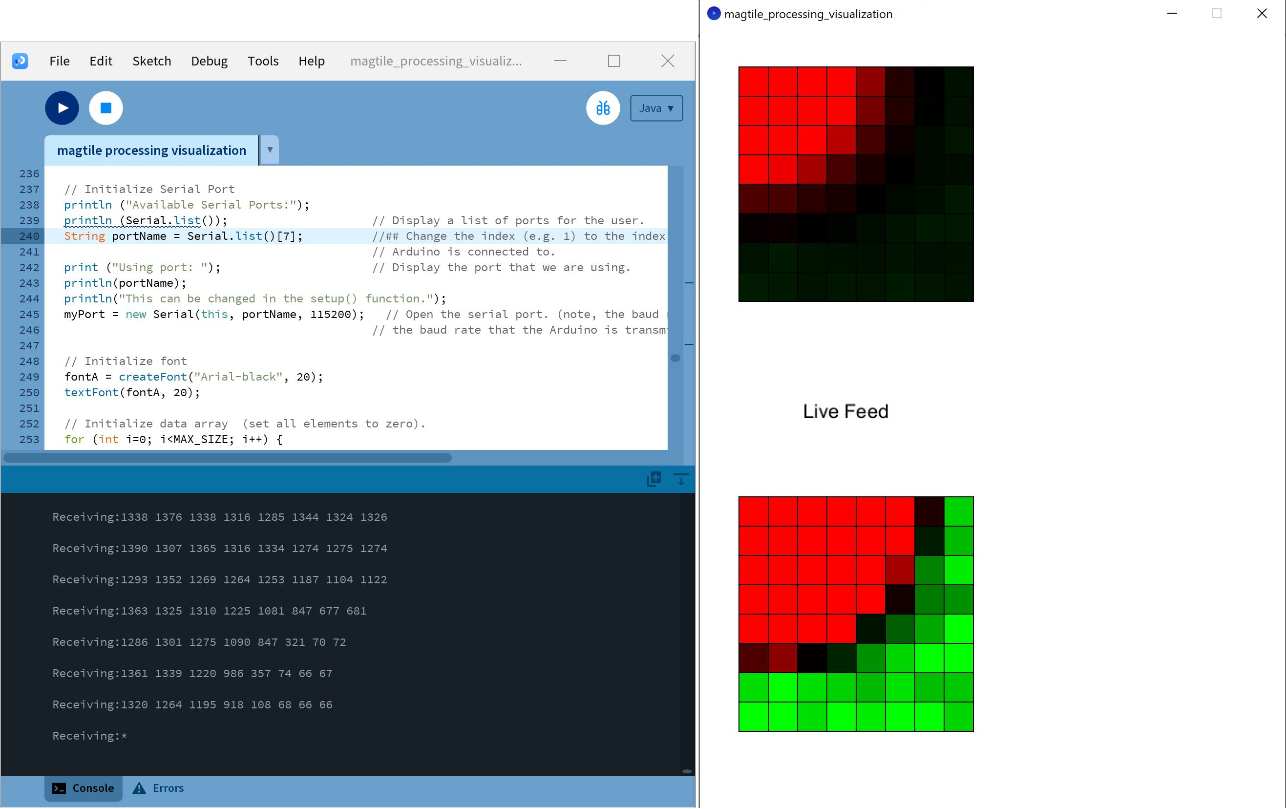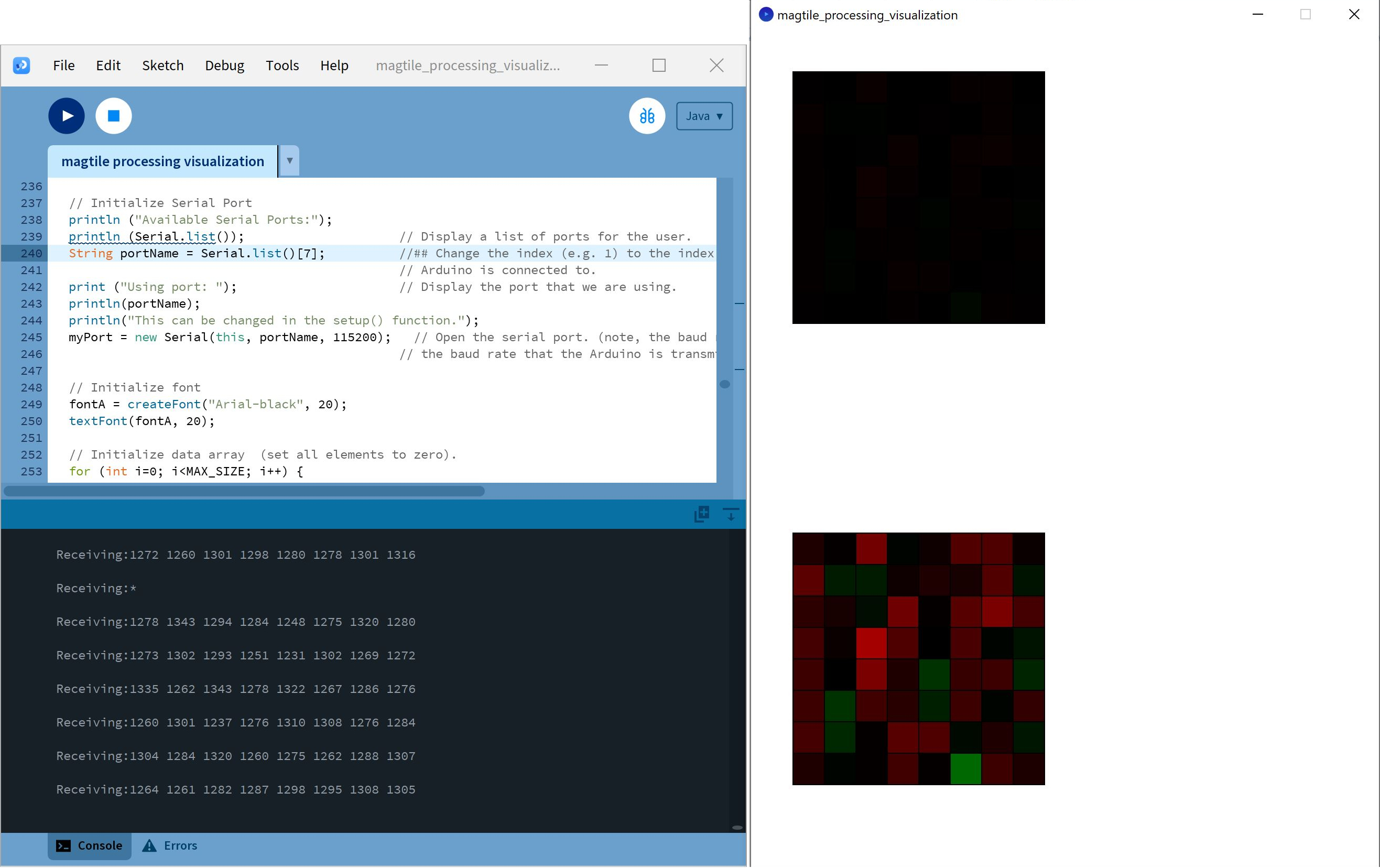 If you look closely at the GIF with a magnet, you will notice that there is a magnetic field on the upper left of the Processing output when the magnet is placed over the Magnetic Imaging Tile. However, the Magnetic Imaging Tile is rotated 90° clockwise with respect to the Processing output as the magnet is placed over the hall effect sensor at (7x7).
