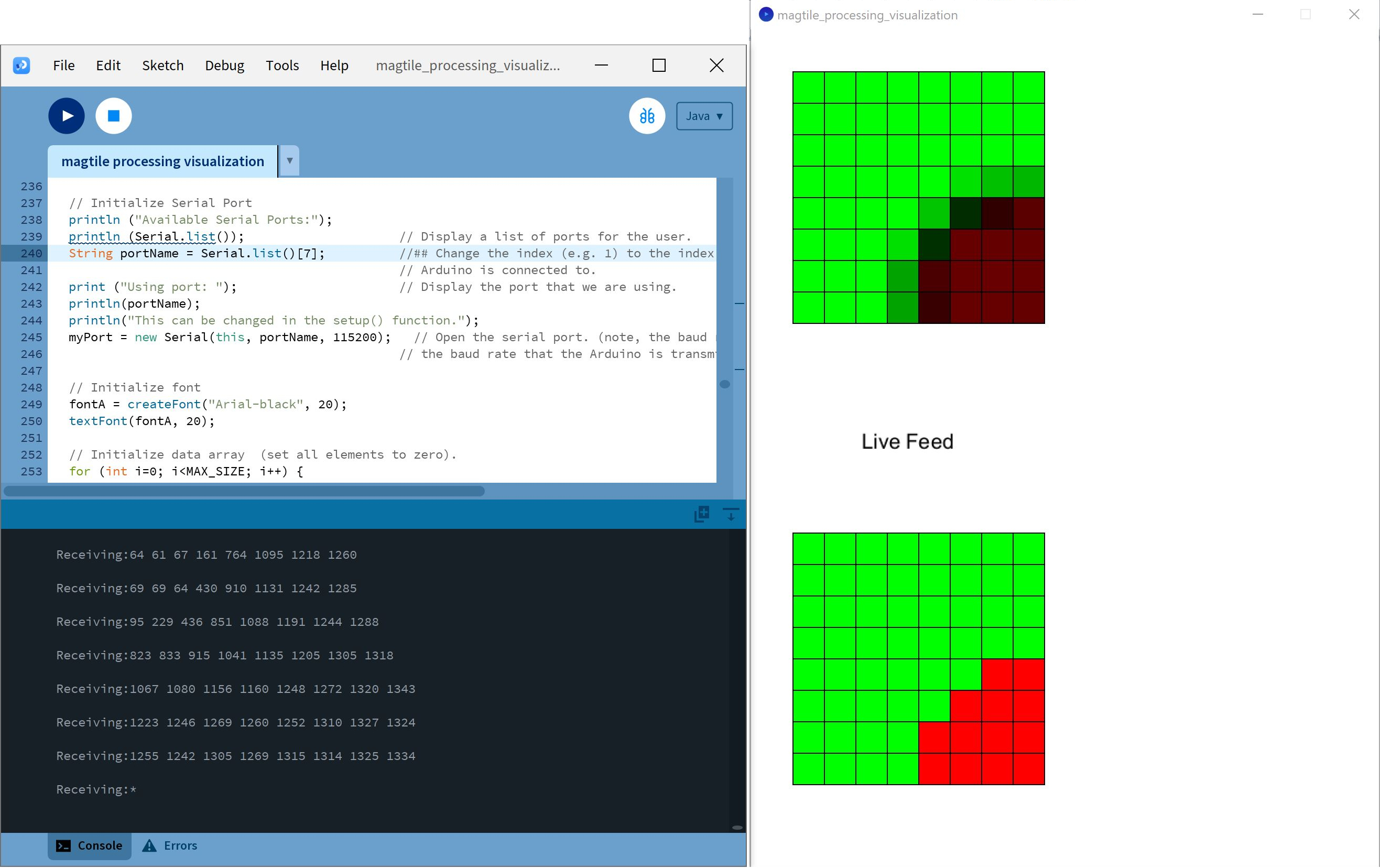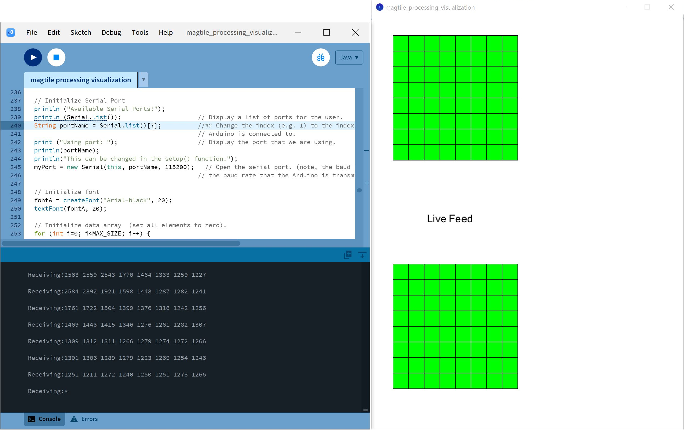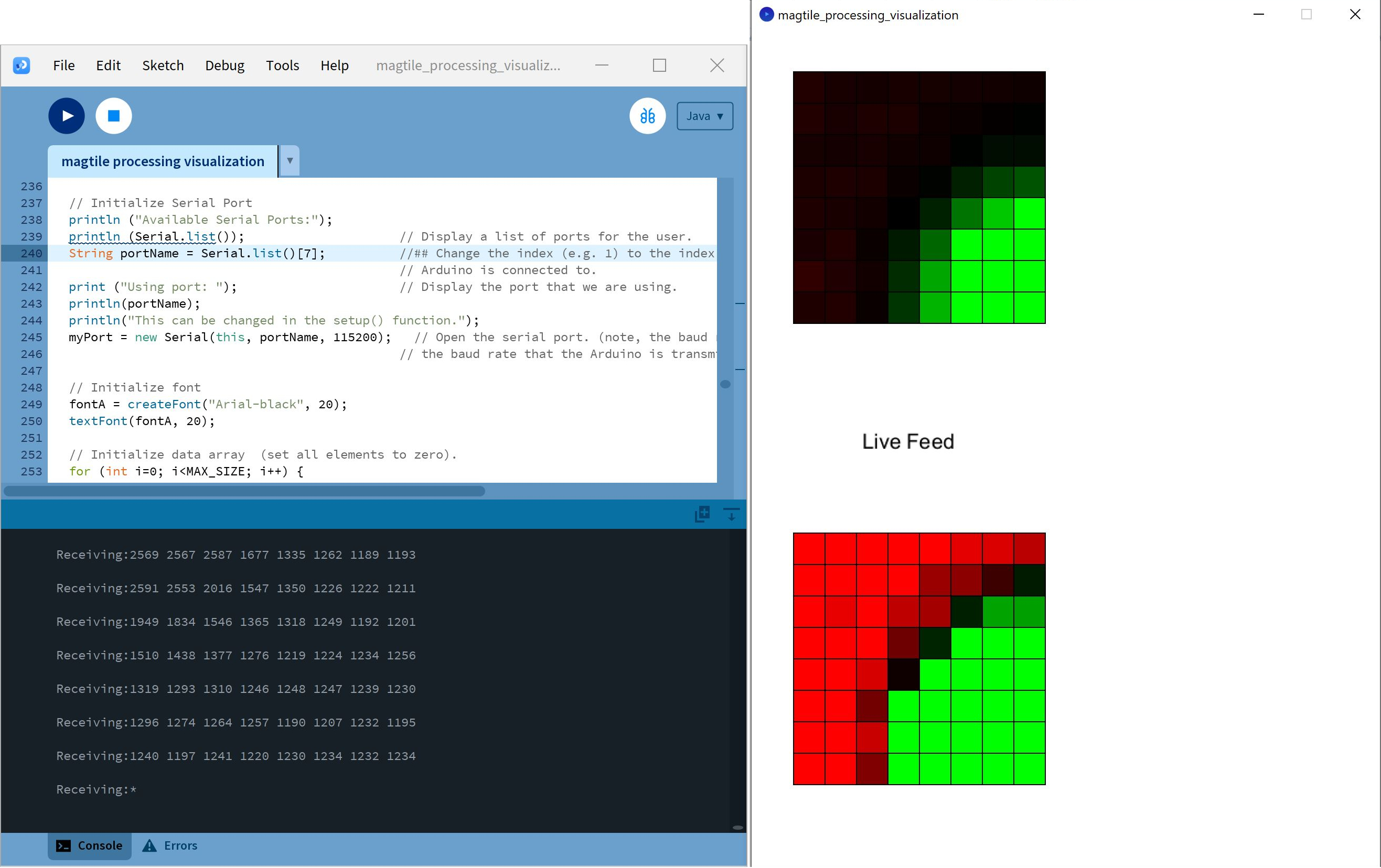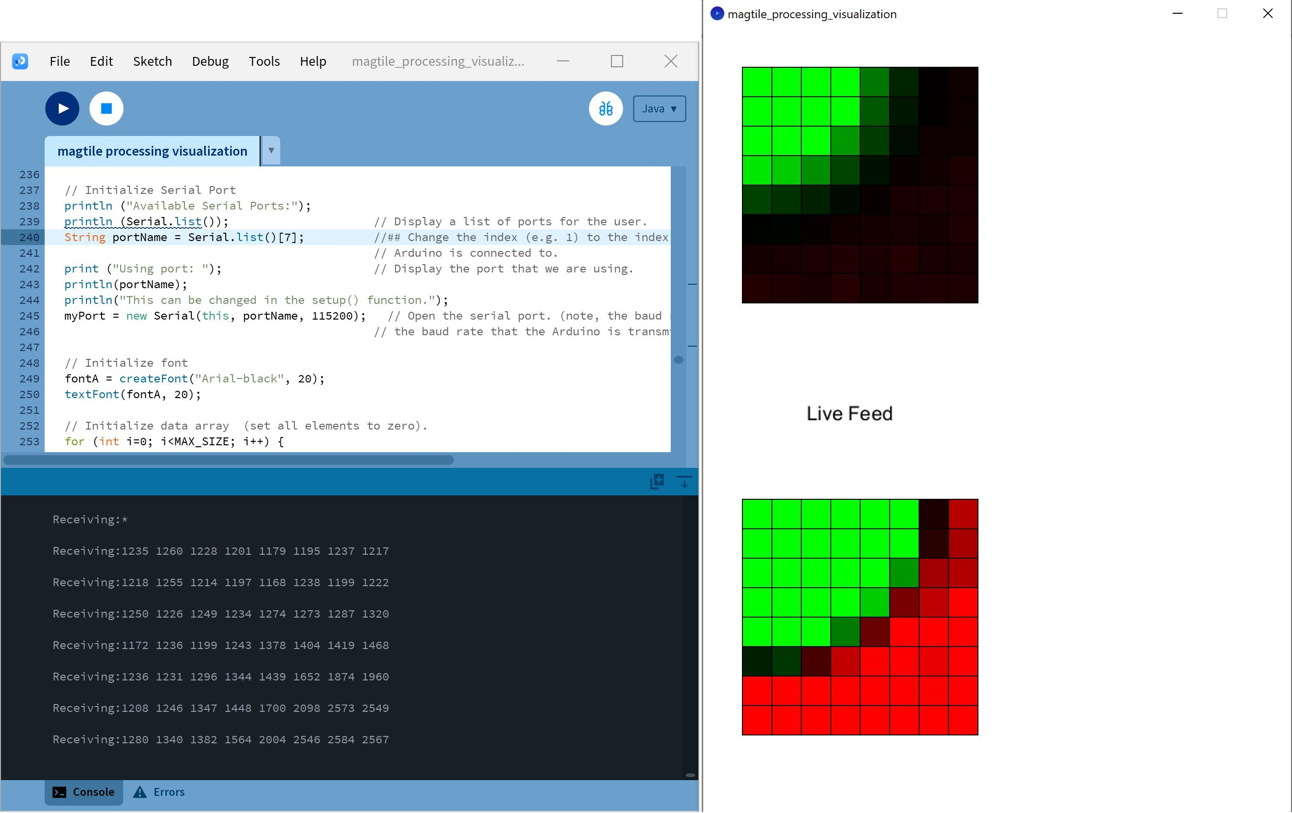 If you look closely at the GIF with a magnet, you will notice that there is a magnetic field on the upper left of the Processing output when the magnet is placed over the Magnetic Imaging Tile. However, the Magnetic Imaging Tile is rotated 90° clockwise with respect to the Processing output as the magnet is placed over the hall effect sensor at (7x7).