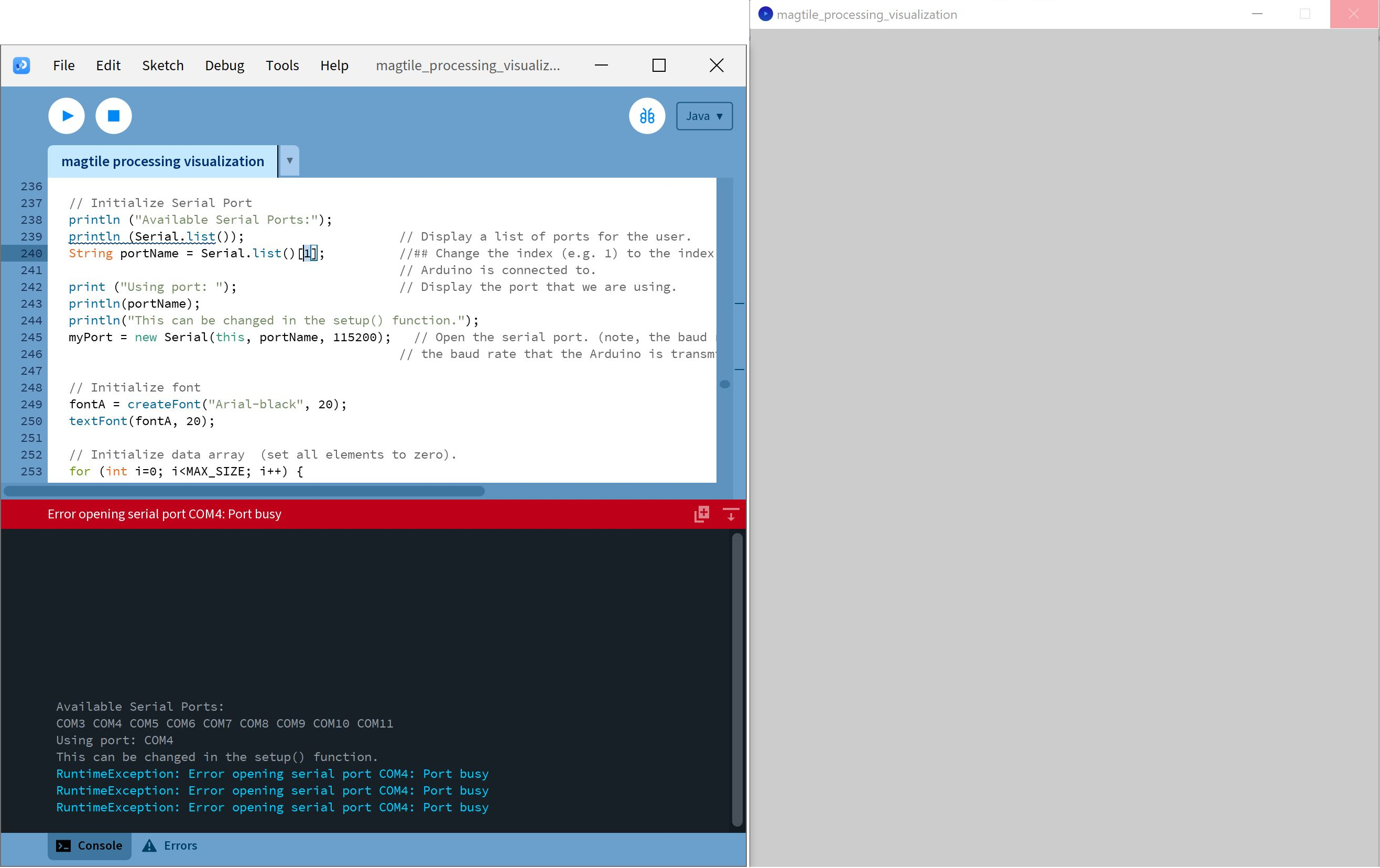 Attempting to run the Processing sketch will show us available serial ports in the debug window from this line of code, where portName