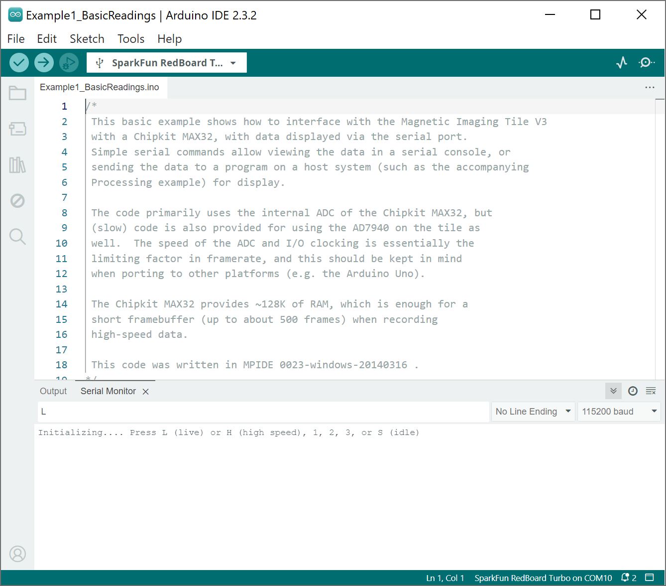 After unzipping the compressed files, navigate to the hardware repo's folder and open the example: ... SparkFun_Magnetic_Imaging_Tile > Software > arduino > Example1_Basic_Readings > Example1_Basic_Readings.ino. This sketch listens for a character before parsing the data. For users using an Arduino microcontroller, select your board in the Tools menu (in our case the SparkFun RedBoard Turbo) and the correct Port it enumerated on.