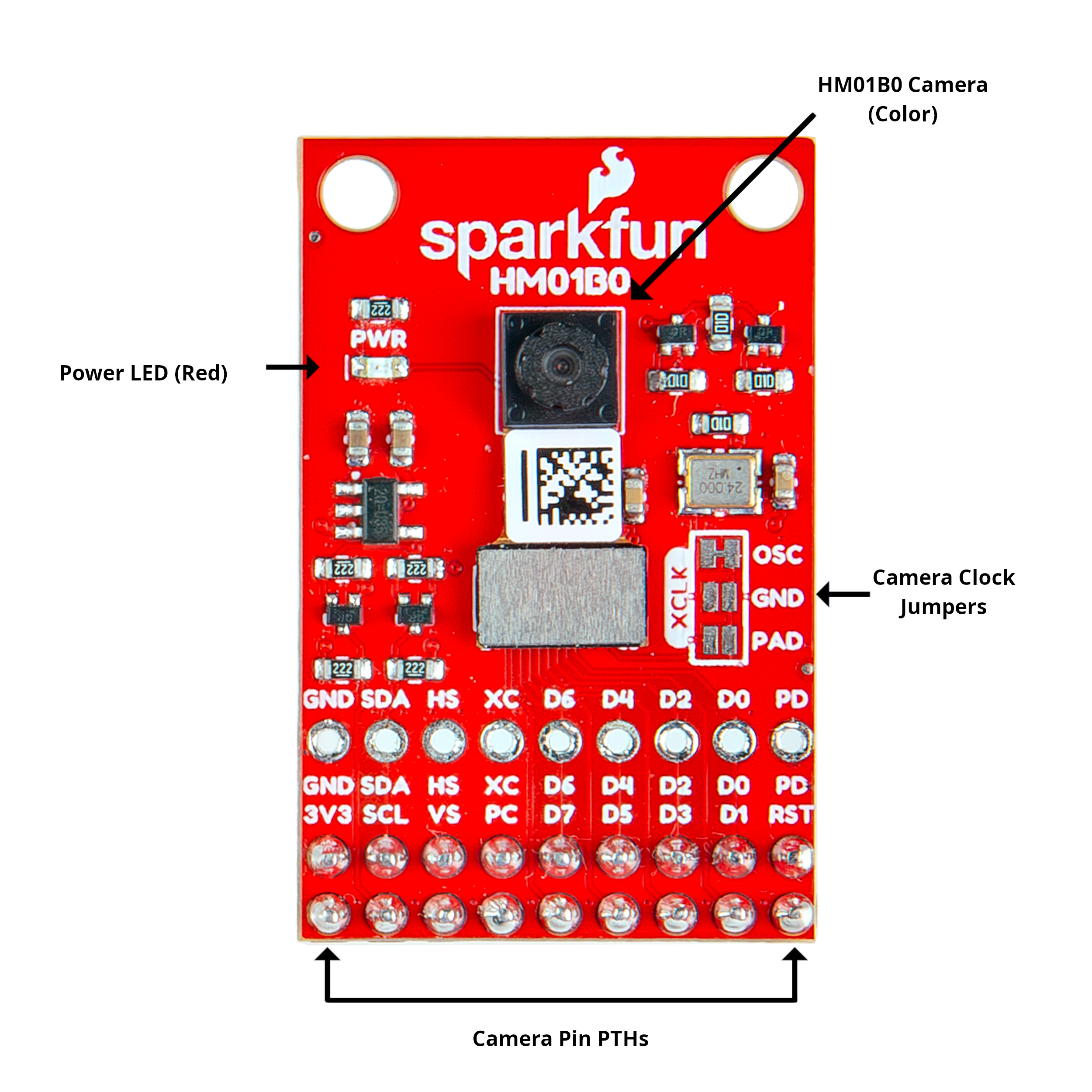 - GND: This solder jumper pulls the HM0B10's XCLK pin to ground to enable the camera's internal 48MHz oscillator. It is OPEN by default. Close the jumper to enable the internal oscillator. Make sure both the OSC and PAD jumpers are OPEN before closing this jumper.
